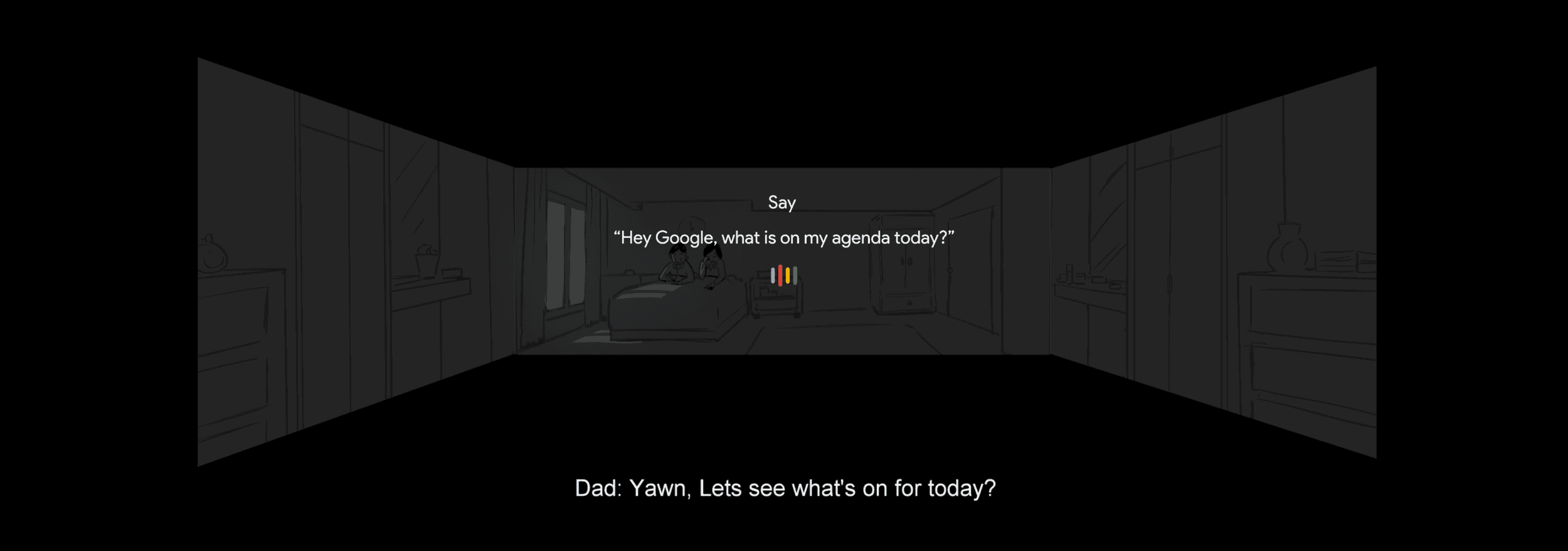 To create a cohesive experience for our project, we first created storyboards to guide the overall narrative and the voice commands and prompts. As the 3D animators worked on bringing the story to life, we simultaneously developed the user interface for the Nest Hub, Pixel phone, and the projection, ensuring a seamless integration across all devices in the room.