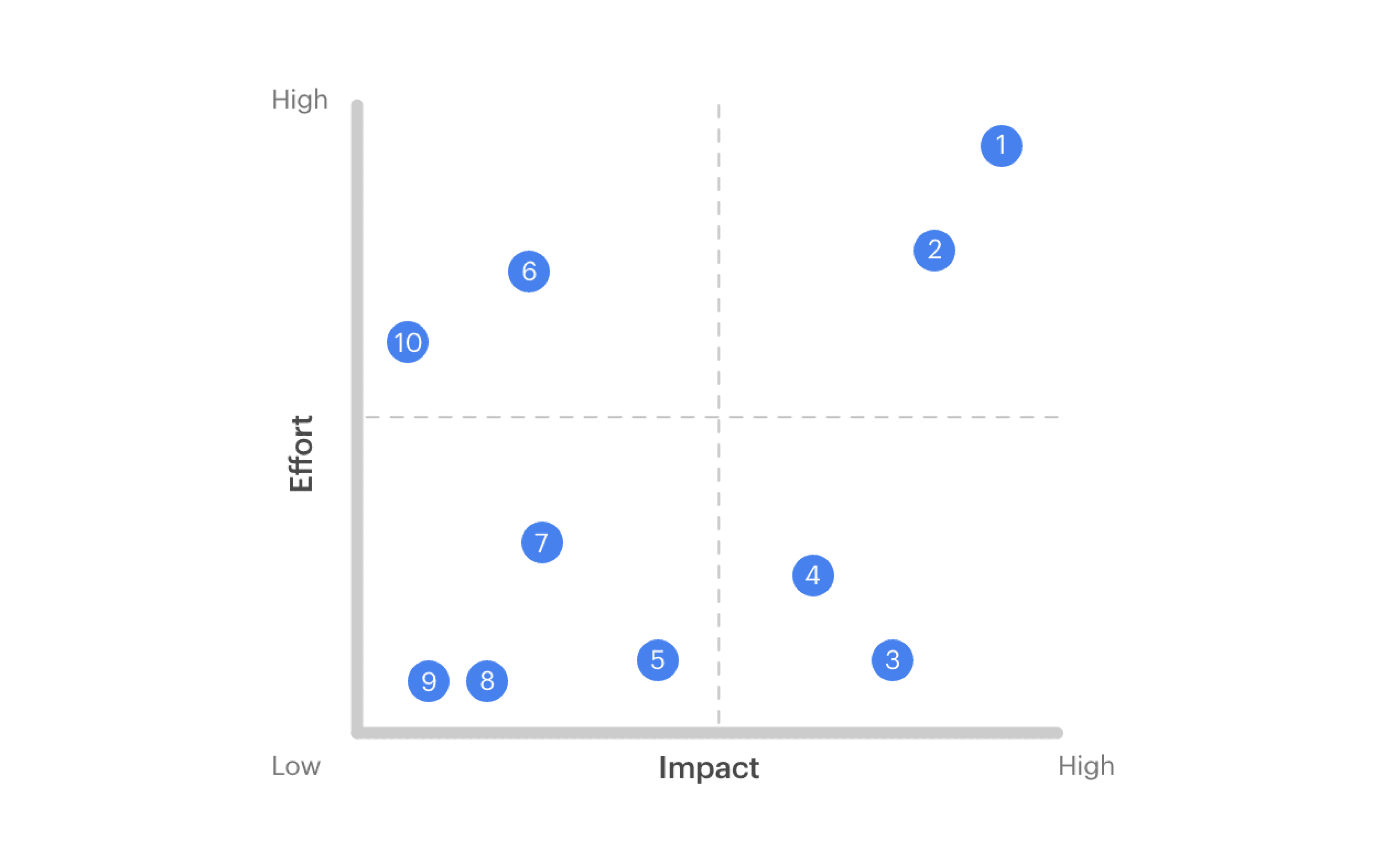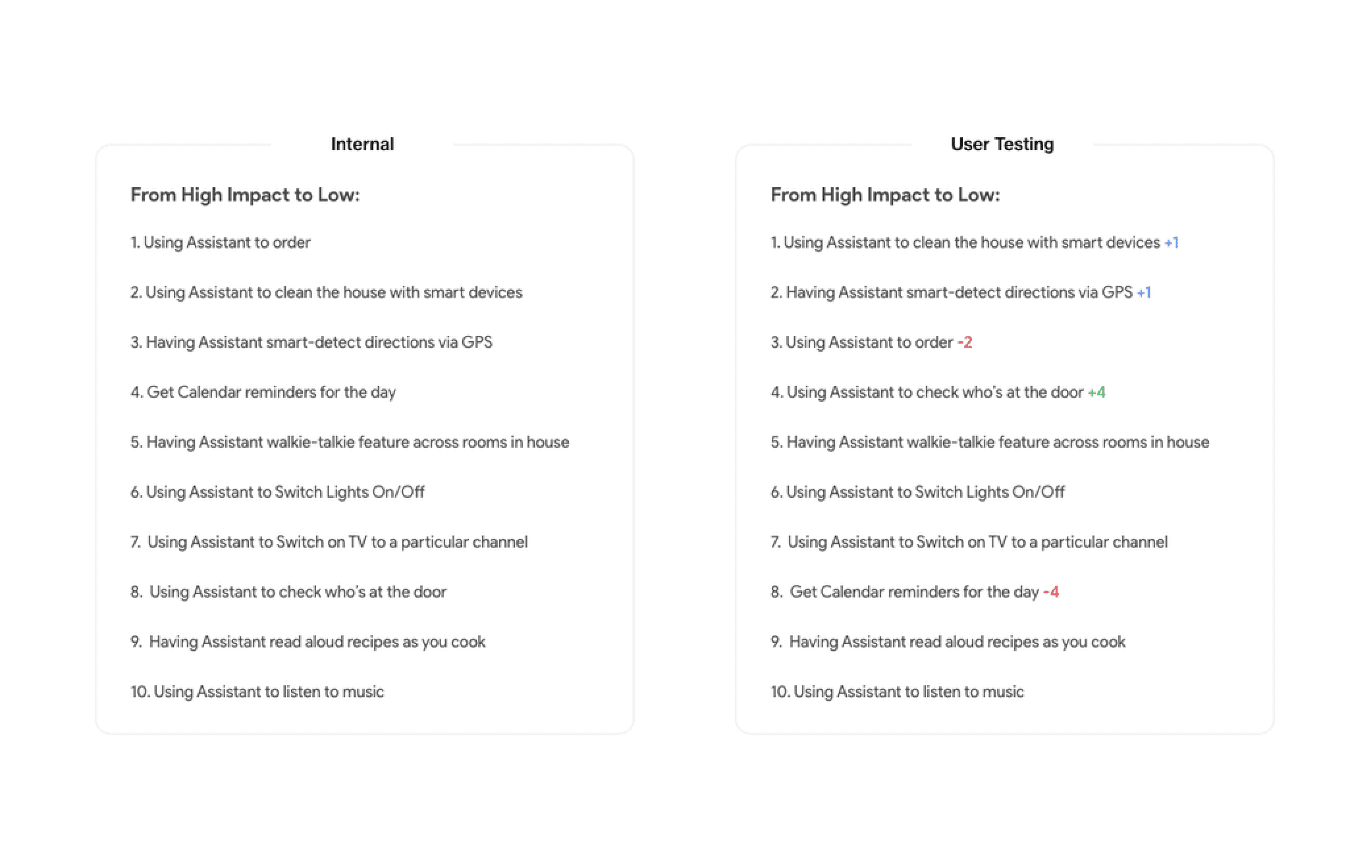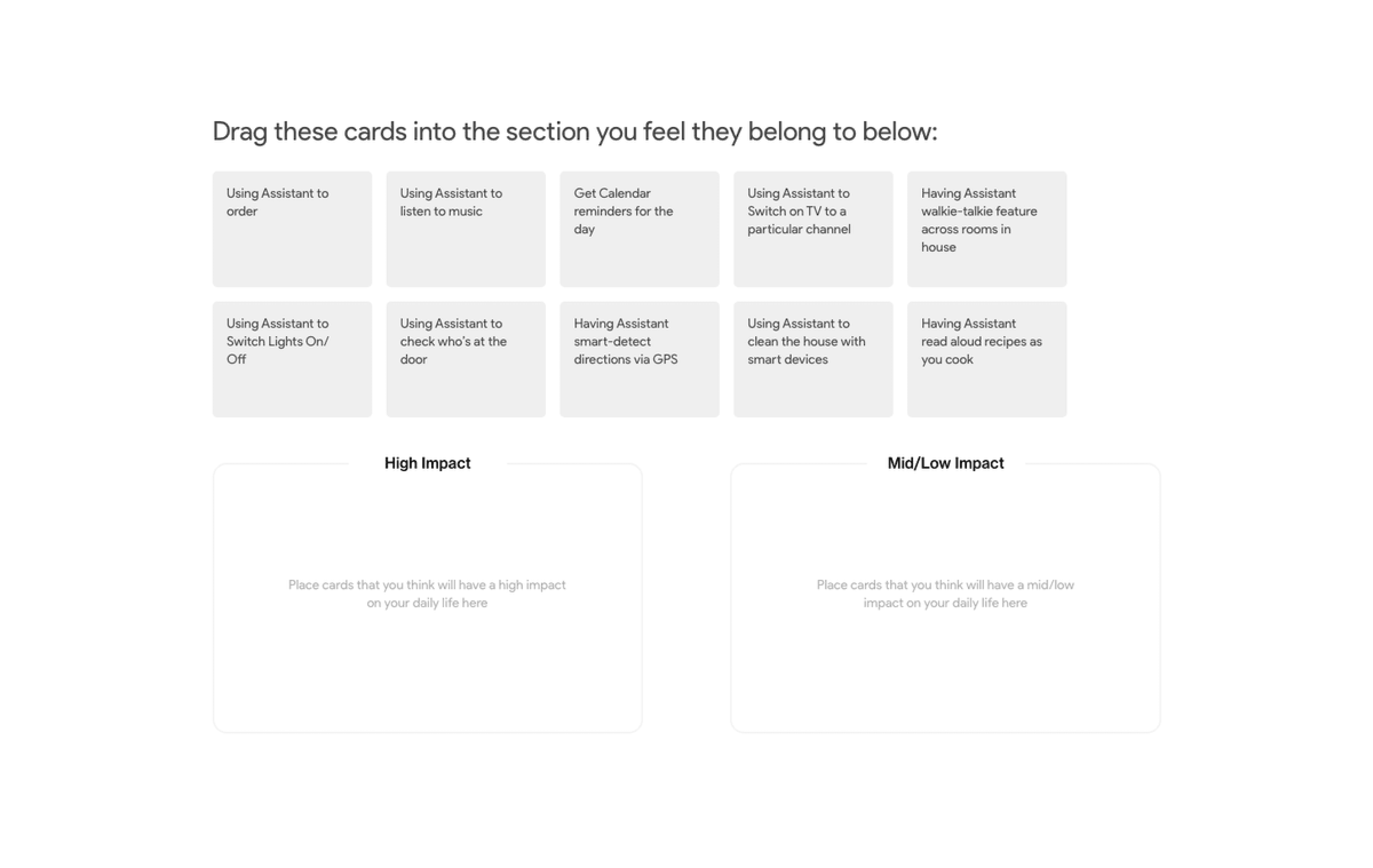 Once we understood the broad pain points, the next step was to sharpen them into clear opportunities. Thankfully, we had access to Google’s wealth of user data, which gave us insight into the frustrations and needs of a diverse user base. To make sense of it all, we began clustering similar insights and features into an affinity map. Patterns quickly started to emerge—showing us where the biggest gaps and opportunities lay. But we didn’t want to rely only on our interpretation. To check whether these groupings matched how users themselves thought, we ran a quick card-sorting exercise. This helped us validate (and in some cases, adjust) our assumptions. With clearer themes in place, we then turned to feasibility. Using a feature prioritization matrix, we plotted ideas by impact versus development effort. This gave the team a realistic way to decide which features could deliver the most value, without overburdening engineering.