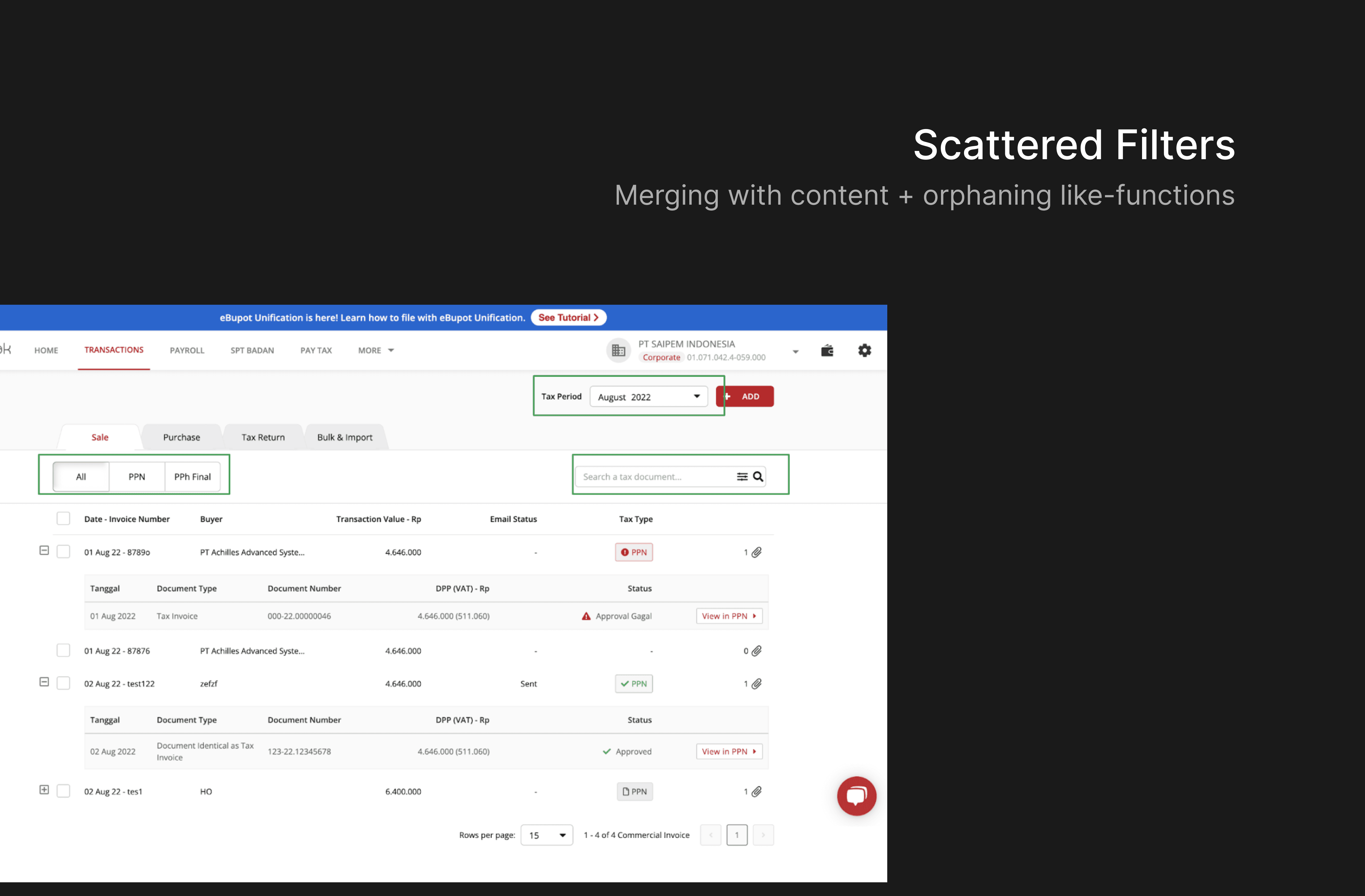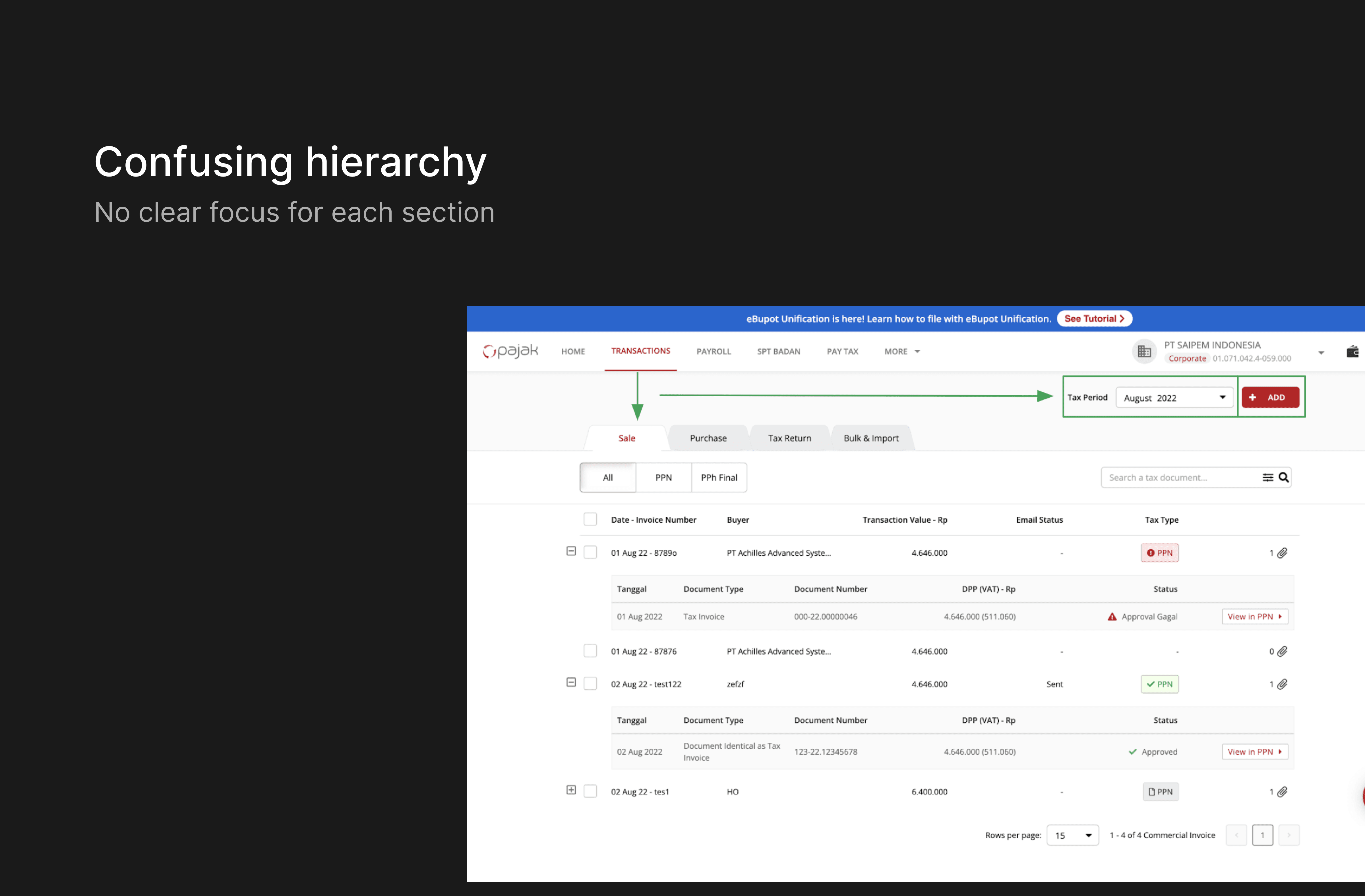 OnlinePajak is a Series-C SaaS platform serving 3M+ users across Indonesia, backed by Sequoia, VISA, Warburg Pincus, and Tencent. I led a research-driven revamp of its Transactions and Invoice Management platform to stay ahead of emerging competitors and drive user activation—while designing for a market outside my own.