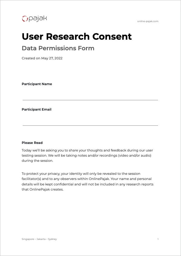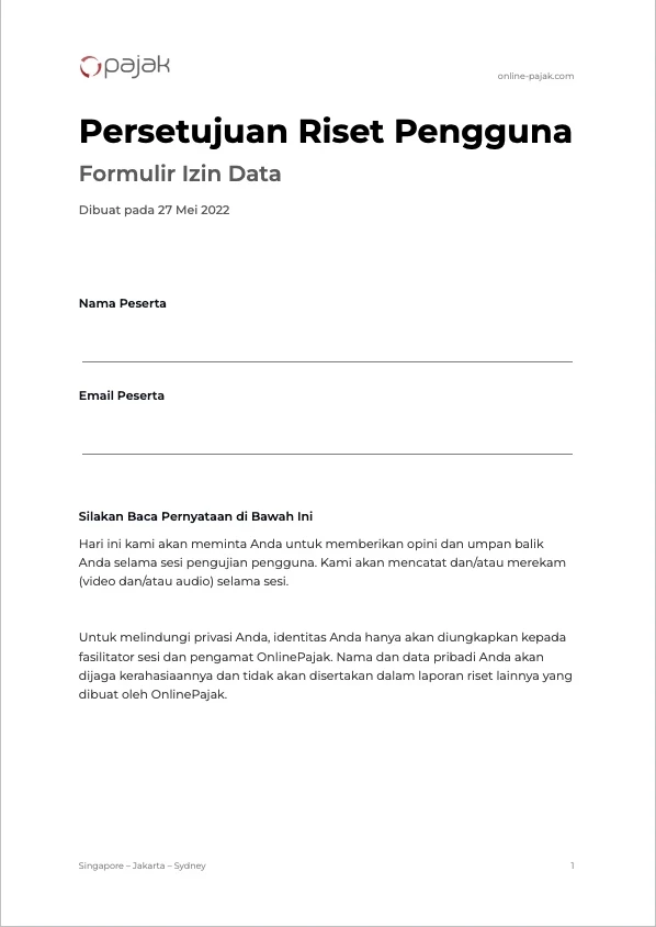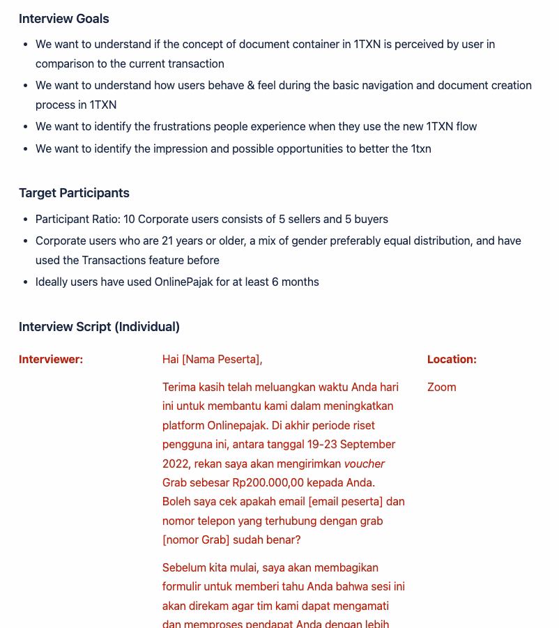 To make the most efficient use of our time, I began preparing the legal and permissions documents for upcoming user interviews in both English and Bahasa. Alongside this, I developed the interview script, structured around three core business archetypes: SMEs, startups, and large enterprises.