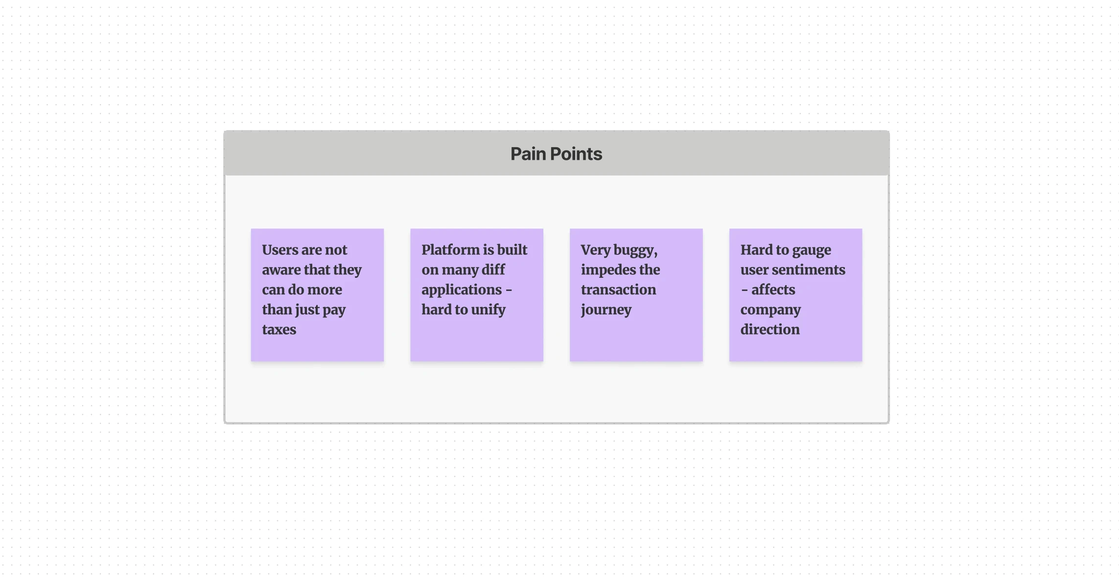 To ground the project, I began by holding one-on-one conversations with key stakeholders including Product Owners, the CEO, the Customer Support team, and Tech Leads. The goal was to understand, in their own words, what the product’s vision truly was and where it was falling short. Through these discussions, it became clear that Transactions was the company’s primary vertical, but the bigger challenge lay in shifting the product’s USP from tax management to invoice management. This repositioning conflicted subtly with the brand’s “tax-first” identity. Beyond strategy, I uncovered several recurring pain points: limited awareness of the product’s full offering, fragmented user journeys within the platform, and a lack of prioritization in feature planning. These insights set the stage for how we would approach the redesign moving forward.