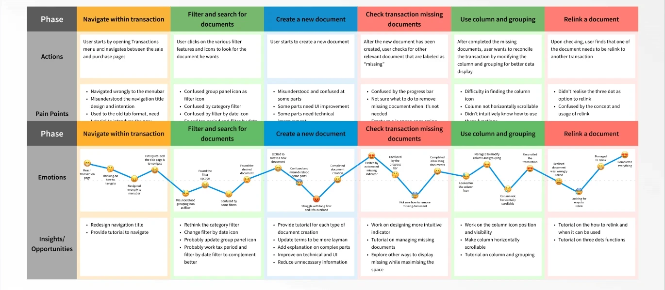 With insights gathered from the user interviews, we began mapping user sentiments across the current platform to visualize where frustration, confusion, or delight occurred. This gave us a clear picture of how users actually experienced the product from start to finish. The open-ended feedback we collected also helped refine our user persona archetypes, adding new layers of context around goals, behaviors, and motivations. By grounding our understanding in empathy, we could better anticipate user expectations at every stage of the journey and redesign each touchpoint not only based on feedback, but also on what users needed the platform to be.