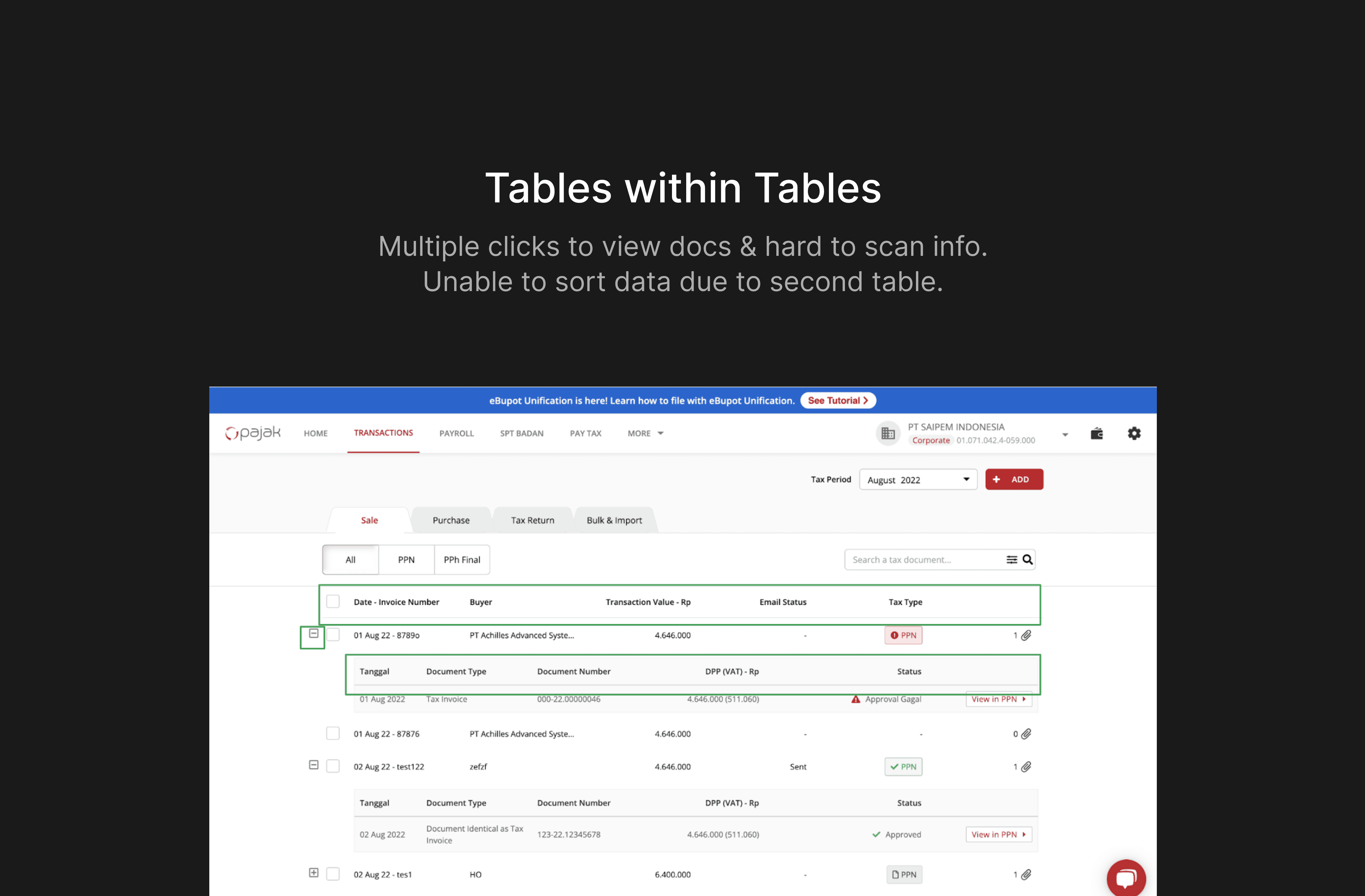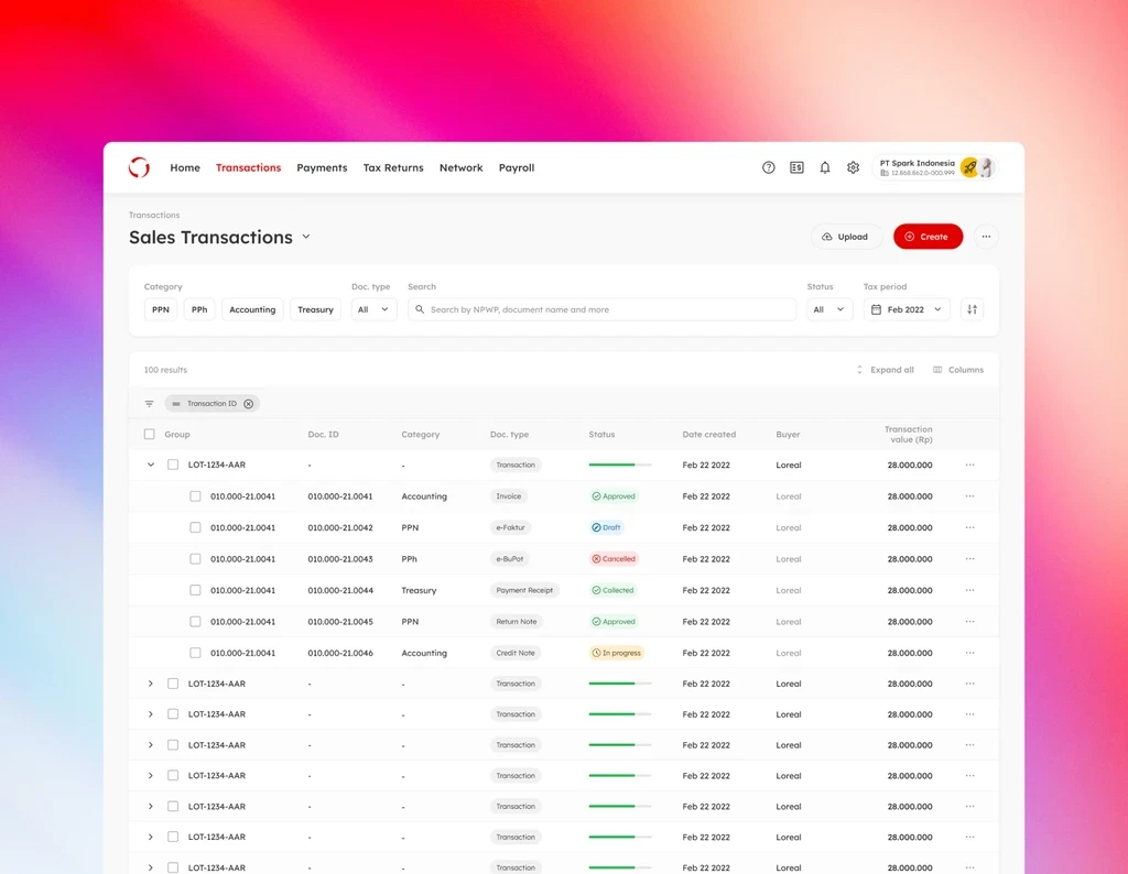 The idea behind One Transaction was simple but powerful. Each transaction would act as a filing system that grouped together its invoice, related tax invoice (e-Faktur), withholding tax document (e-BuPot), and payment receipt—making it easier for users to reconcile documents across vendors.
