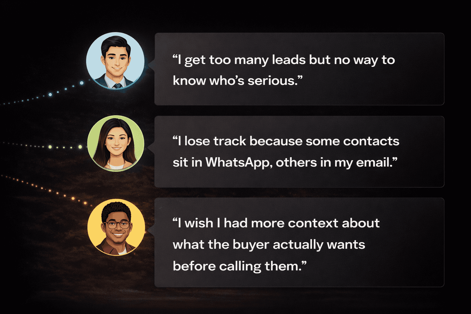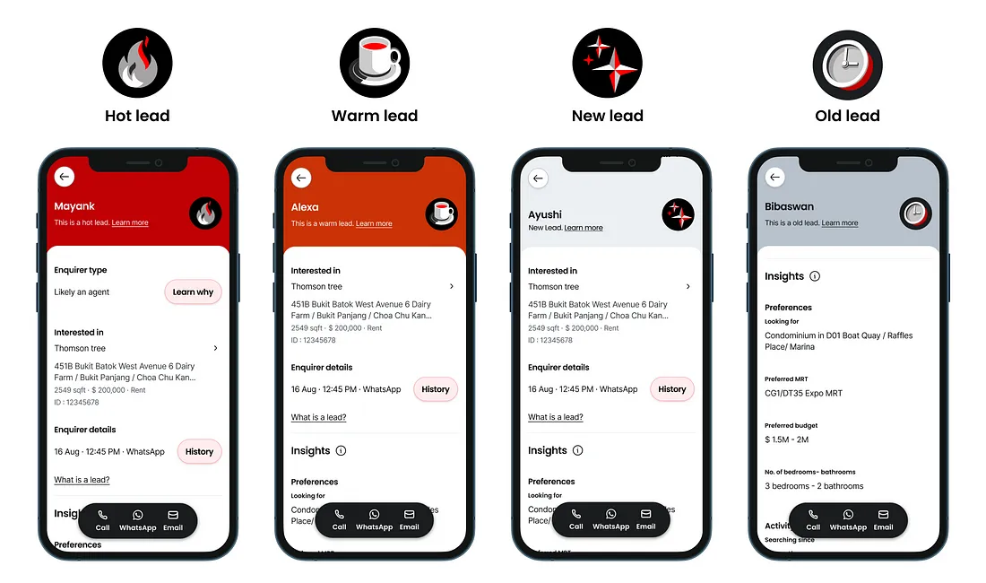 Agent workflows were scattered and inefficient. Enquiries arrived from multiple channels, leaving agents to juggle names, listings, and follow-ups across disconnected tools. This chaos made it difficult to spot serious buyers from casual browsers.