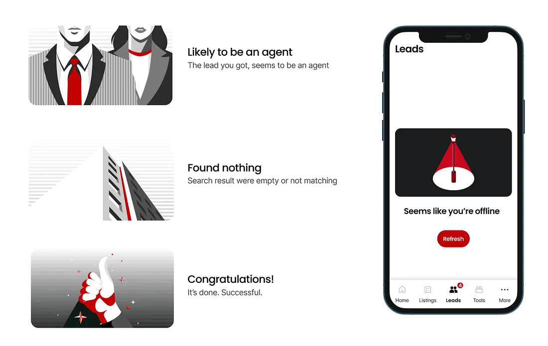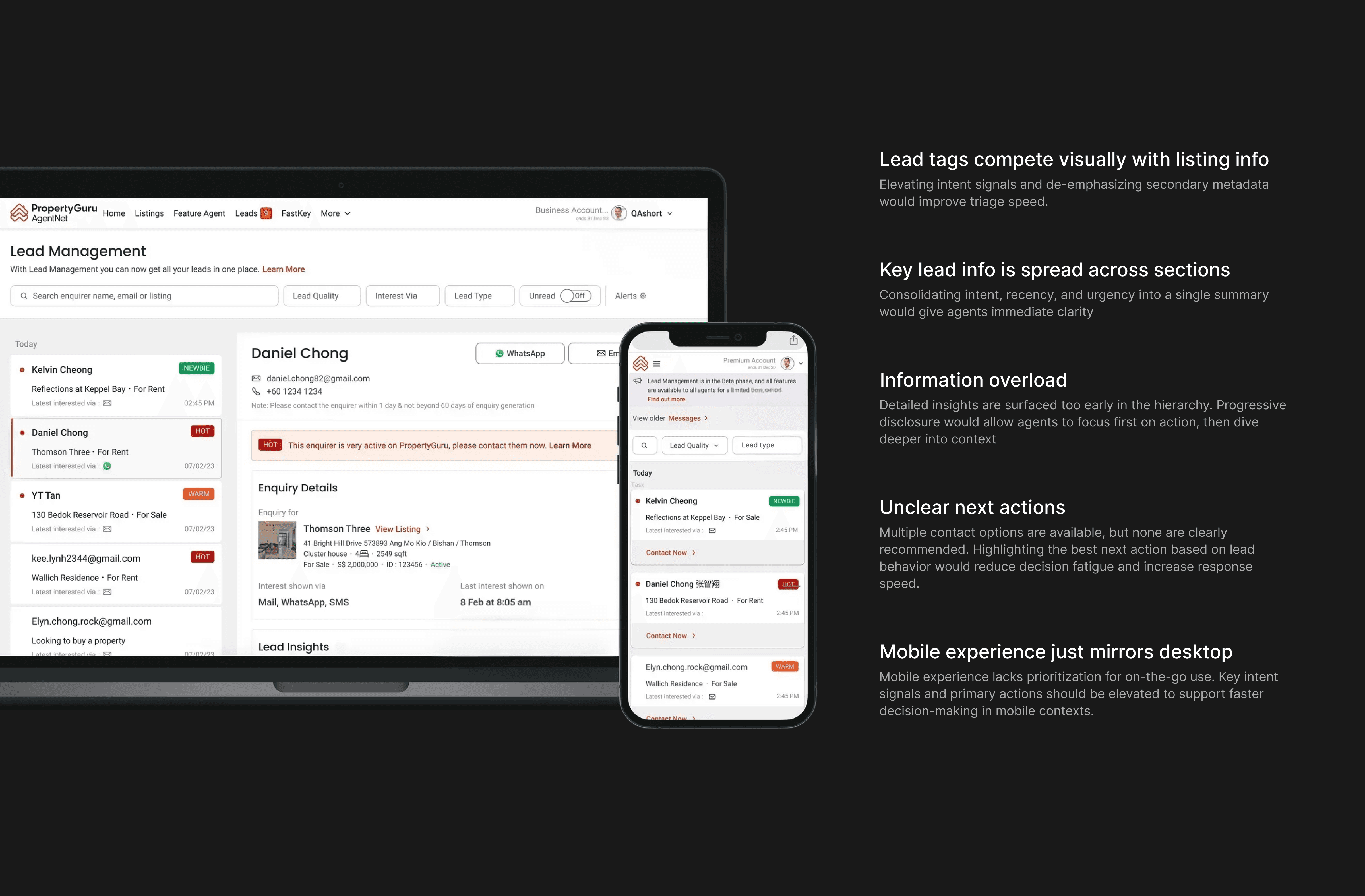 Through agent interviews, we heard recurring frustrations. This wasn’t just about volume. It was about clarity, confidence, and speed. Agents needed to focus on the right people with the right context. To complement this, I led a heuristics review of existing lead flows. It confirmed overloaded navigation, buried key actions, and poor visual hierarchy. This provided a baseline for alignment with Product and Engineering, ensuring we tackled root issues rather than surface fixes.
