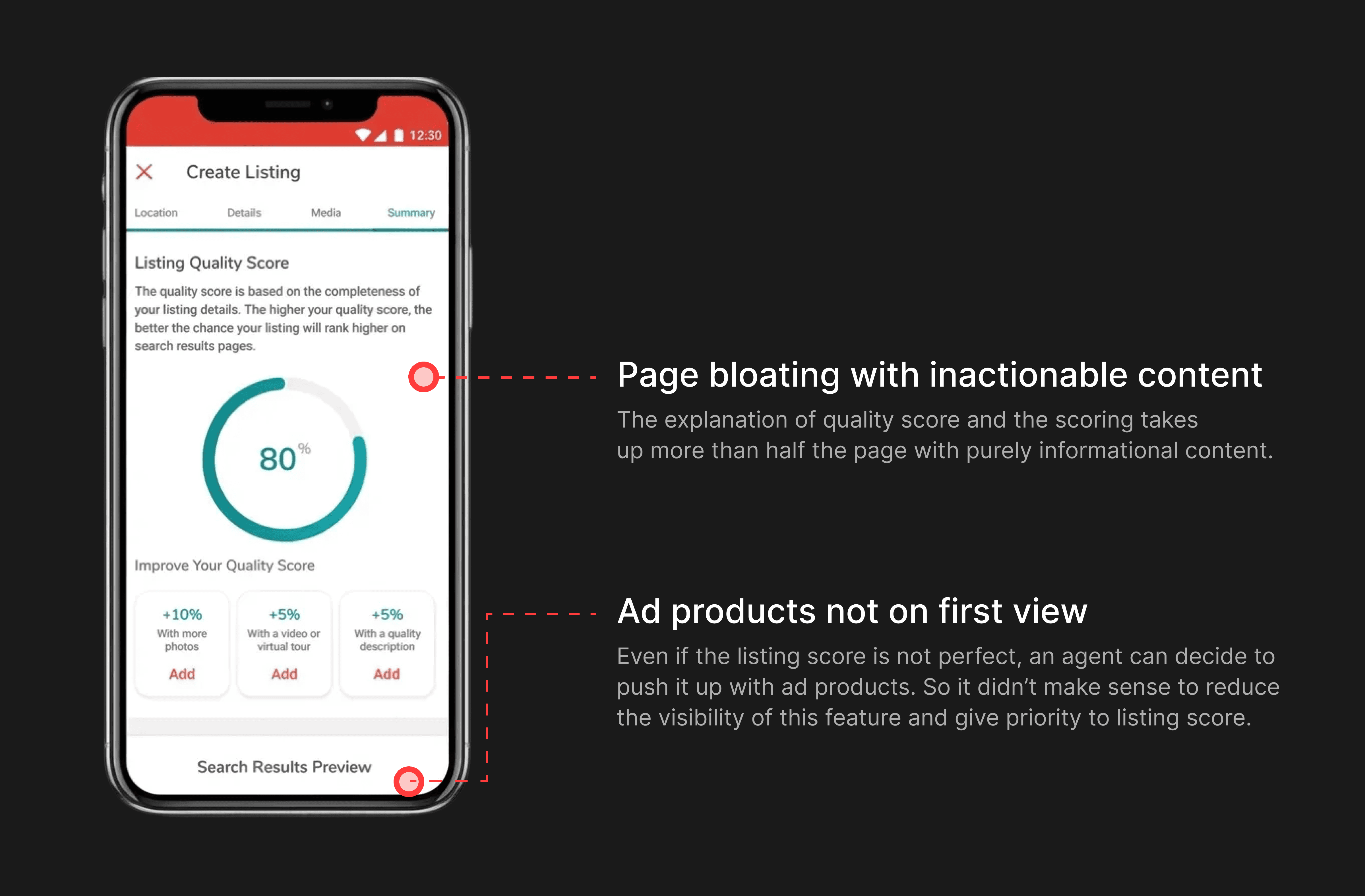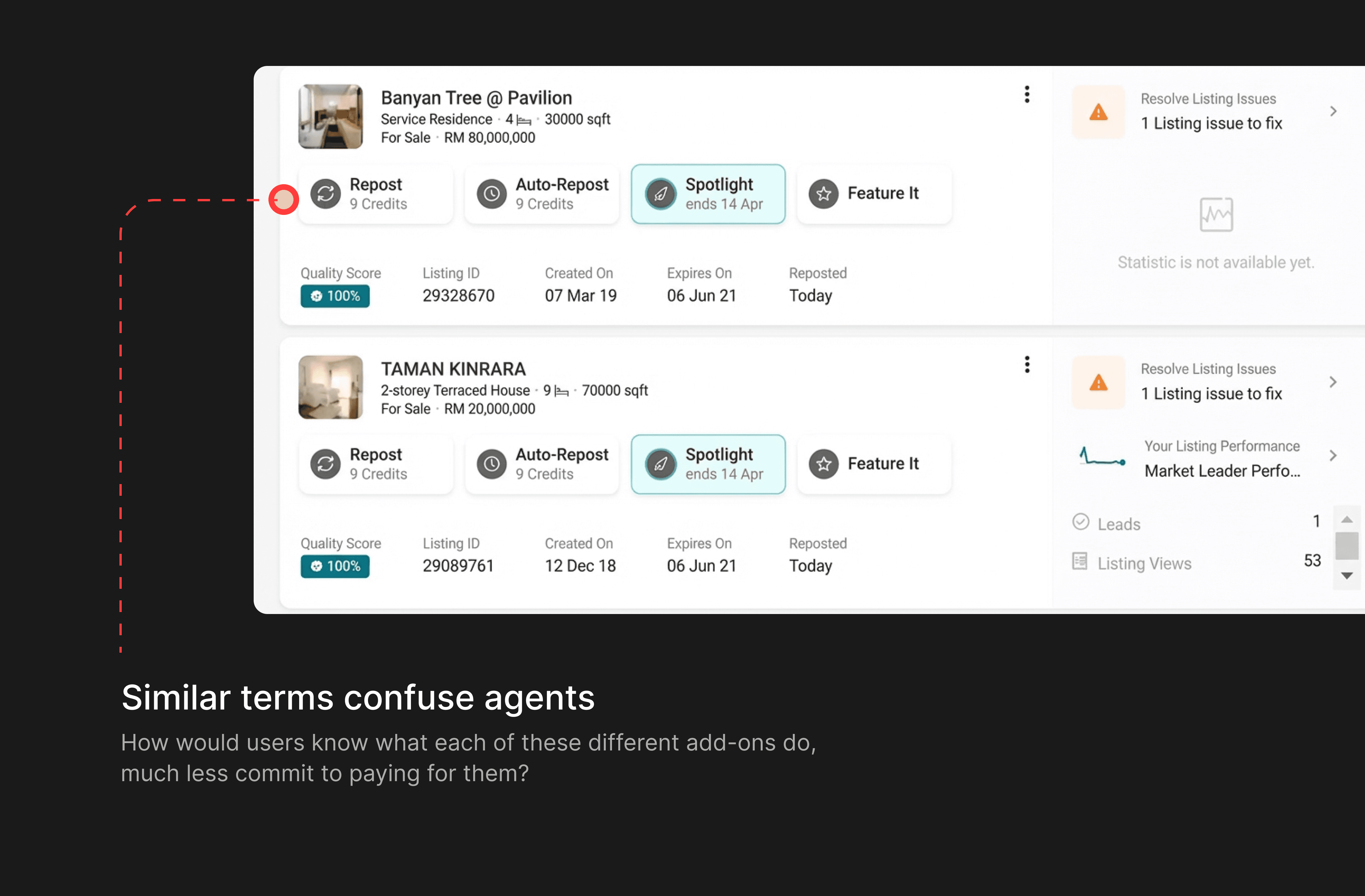Before getting introduced to the project, I already had some observations in mind from my newbie analysis of the product. This gave me an unbiased view (the agents' view) without the shades of business needs or tech constraint clouding my vision. These were our main observations: 1. There were too many ad product terms - and external users would be too confused about what they do to spend money on them. 2. Agents were already paying a pretty penny for subscriptions, they would be reluctant to spend further if they aren't able to see what benefit they might get from that spend. 3. If not all thrown at once on a page, ad product upselling was done as one pop-up after another - really frustrating to deal with. 4. At the last stage of posting a listing, the entire mobile screen is taken up by listing quality score and upselling for products such as Boost appears as a simple line item at the bottom of the page. This signalled a severe lack of visibility and awareness of the product/feature.