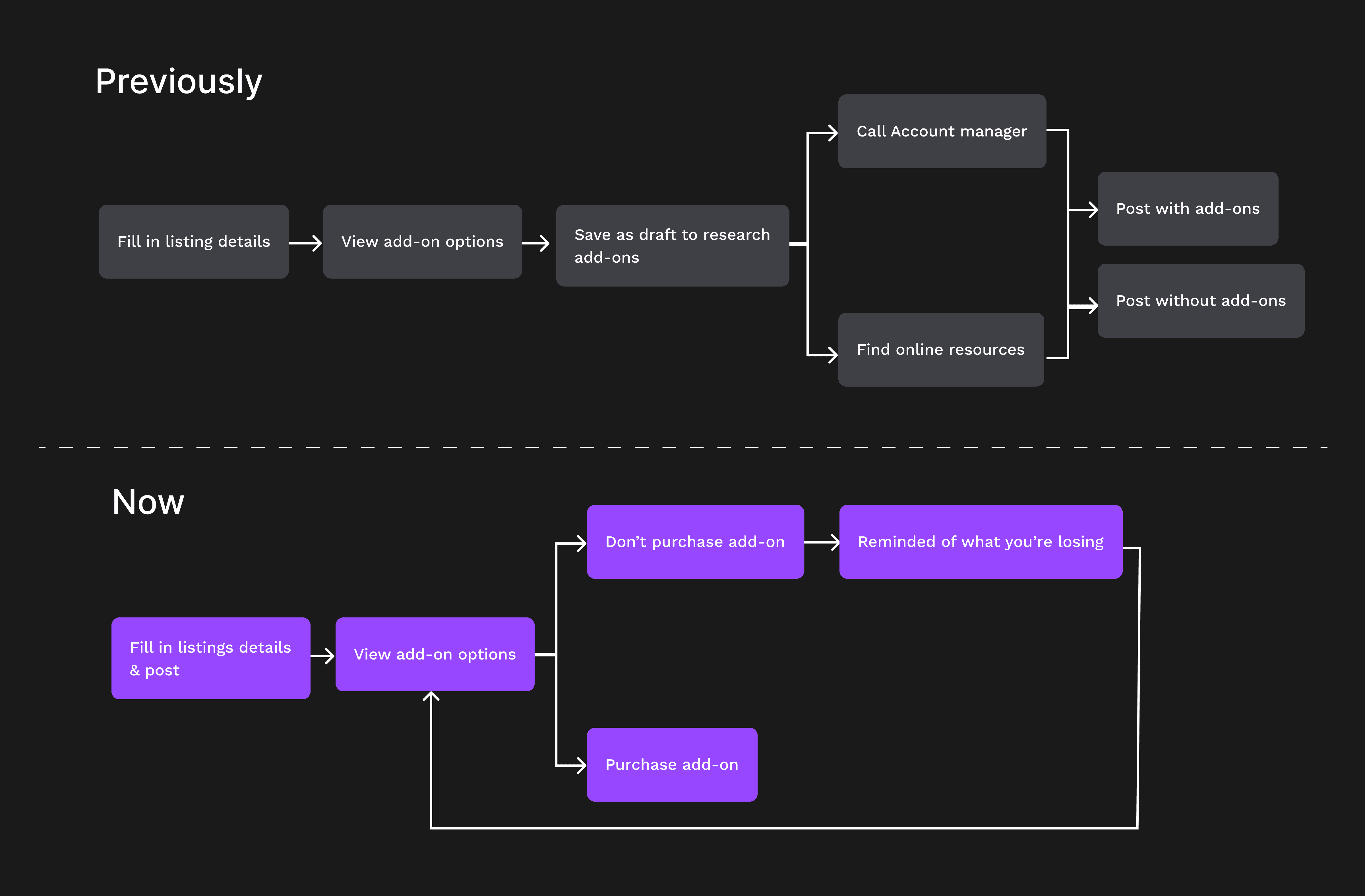 With a clearer direction now, it was easier to visualise the full journey. A major improvement was the reduction of back and forth for the vague understanding of the product - as well, the lack of hesitance to pull out of a previous purchase by contacting a customer service agent. The biggest bonus here was getting users to commit to posting a listing sooner - this indirectly would reduce drop offs as well.