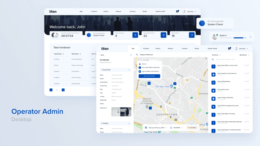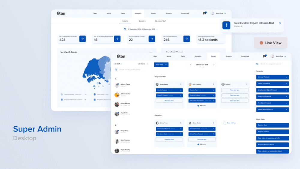 Certis uses Titan, an incident management system, internally. Titan consists of a mobile app for on-ground security staff and a web admin platform for operators and senior management. The system digitizes the way staff records, manages, and analyzes incidents while also monitoring their health and alertness for their welfare.