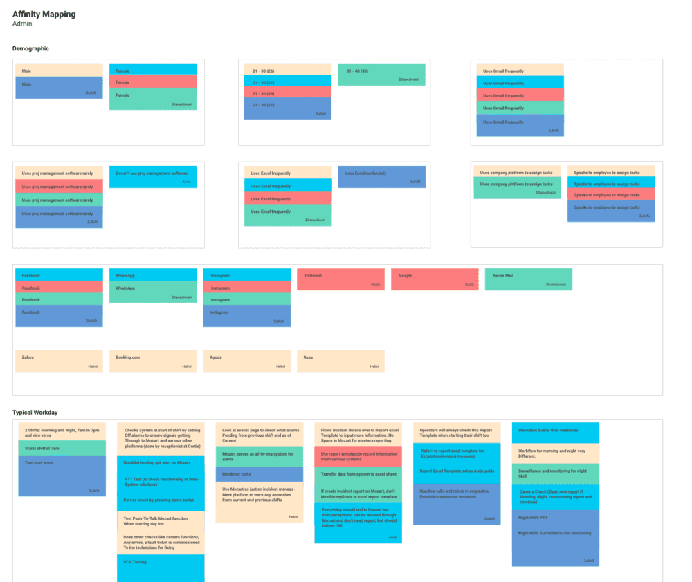 We transcribed the interview responses into sticky notes and grouped them thematically. However, some of the notes were falling off the wall and affecting the data, so we switched to digitizing the process using Adobe XD. This kept the data intact and made it more flexible for future use.