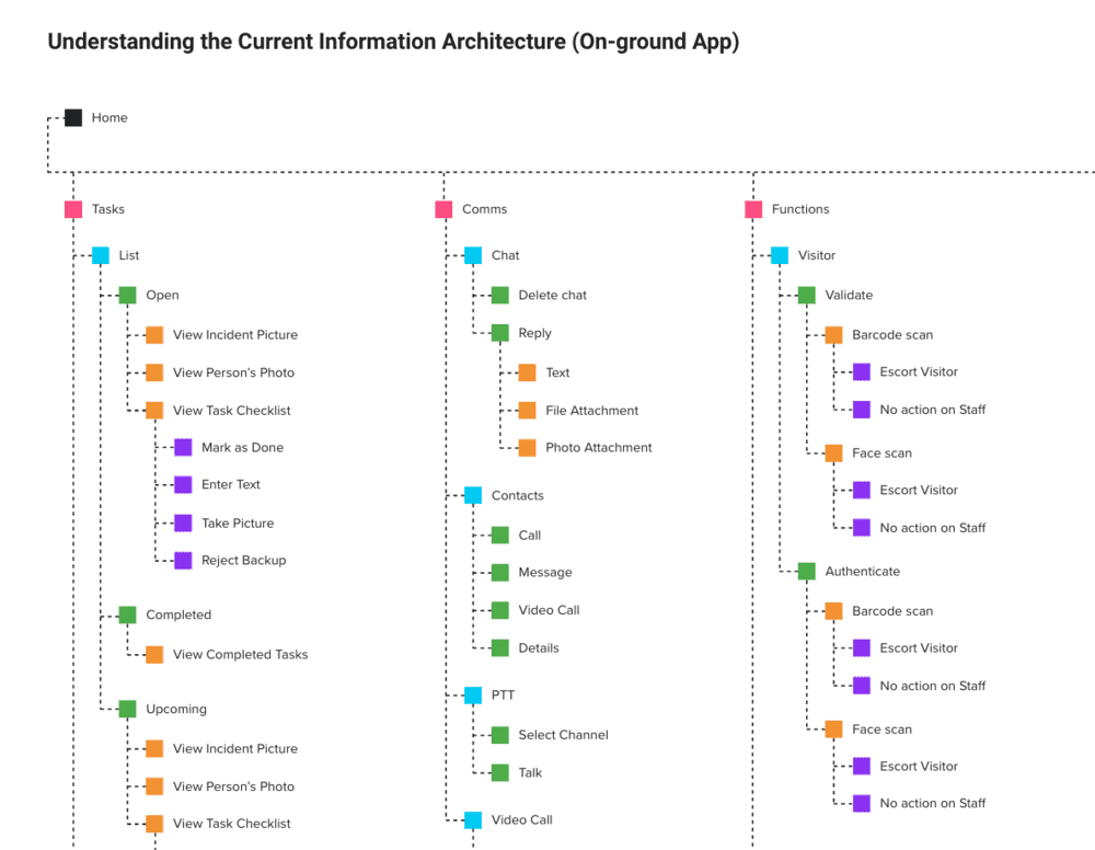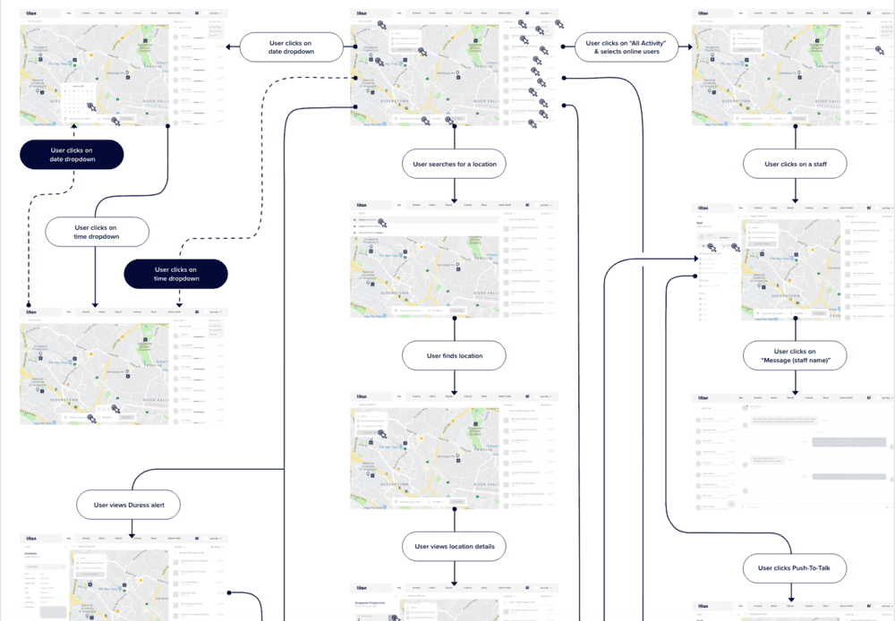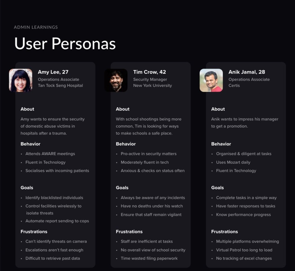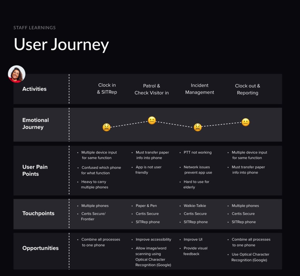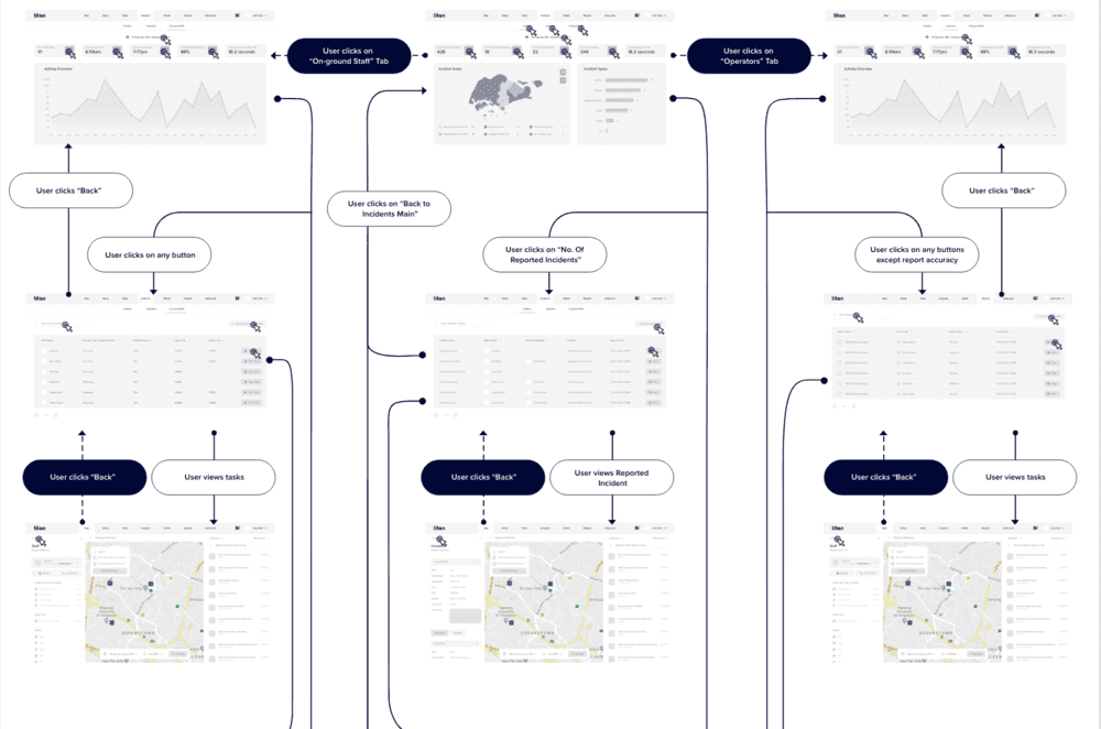 We created user personas for on-ground security staff, operator admins, and superadmins, which helped us empathize with their needs and identify opportunities for improvement. Using a user journey chart, we mapped out their everyday tasks and what they needed to achieve to create a product that better suited their needs.