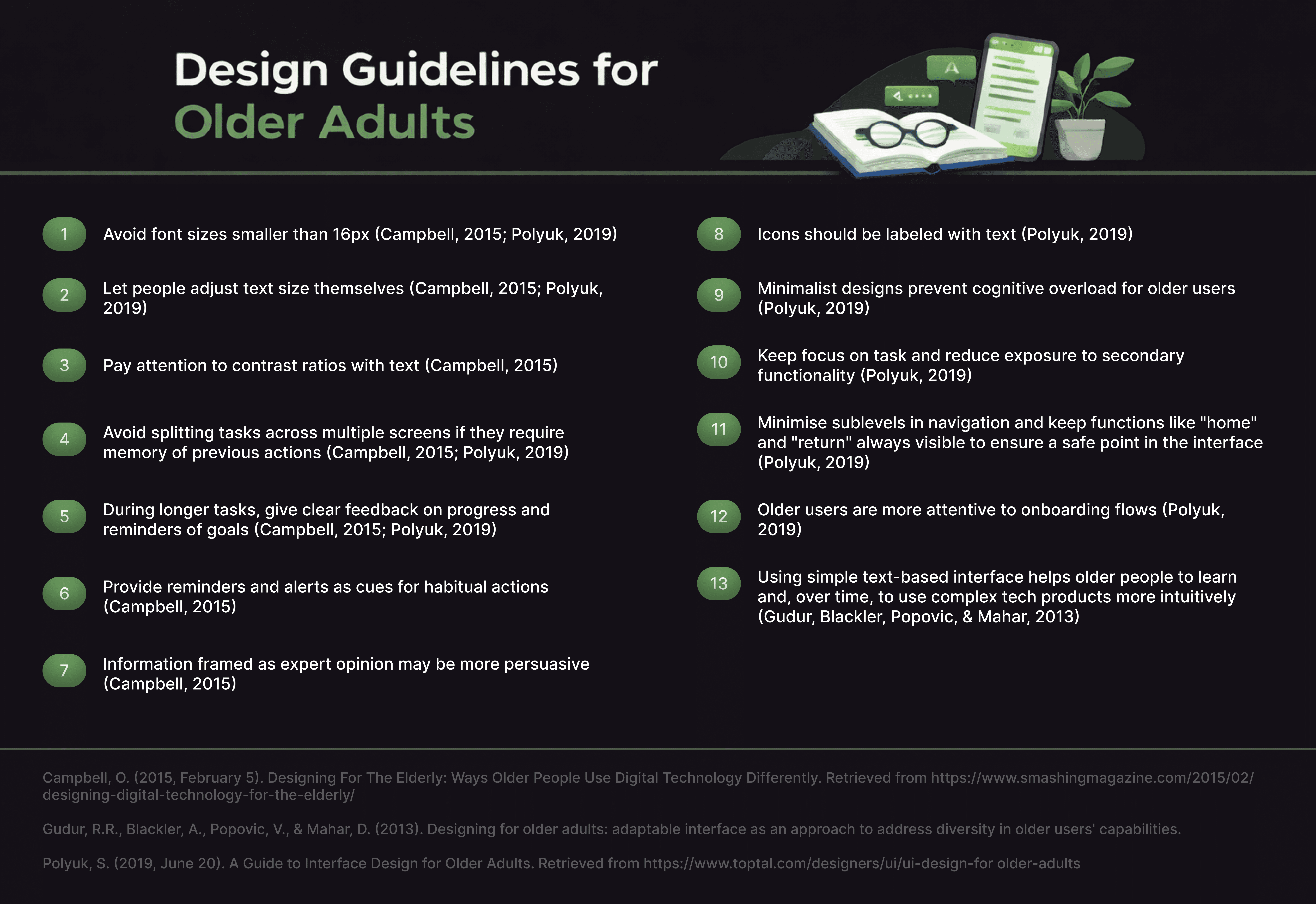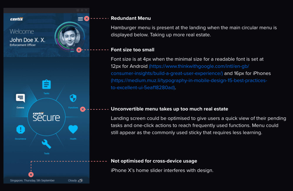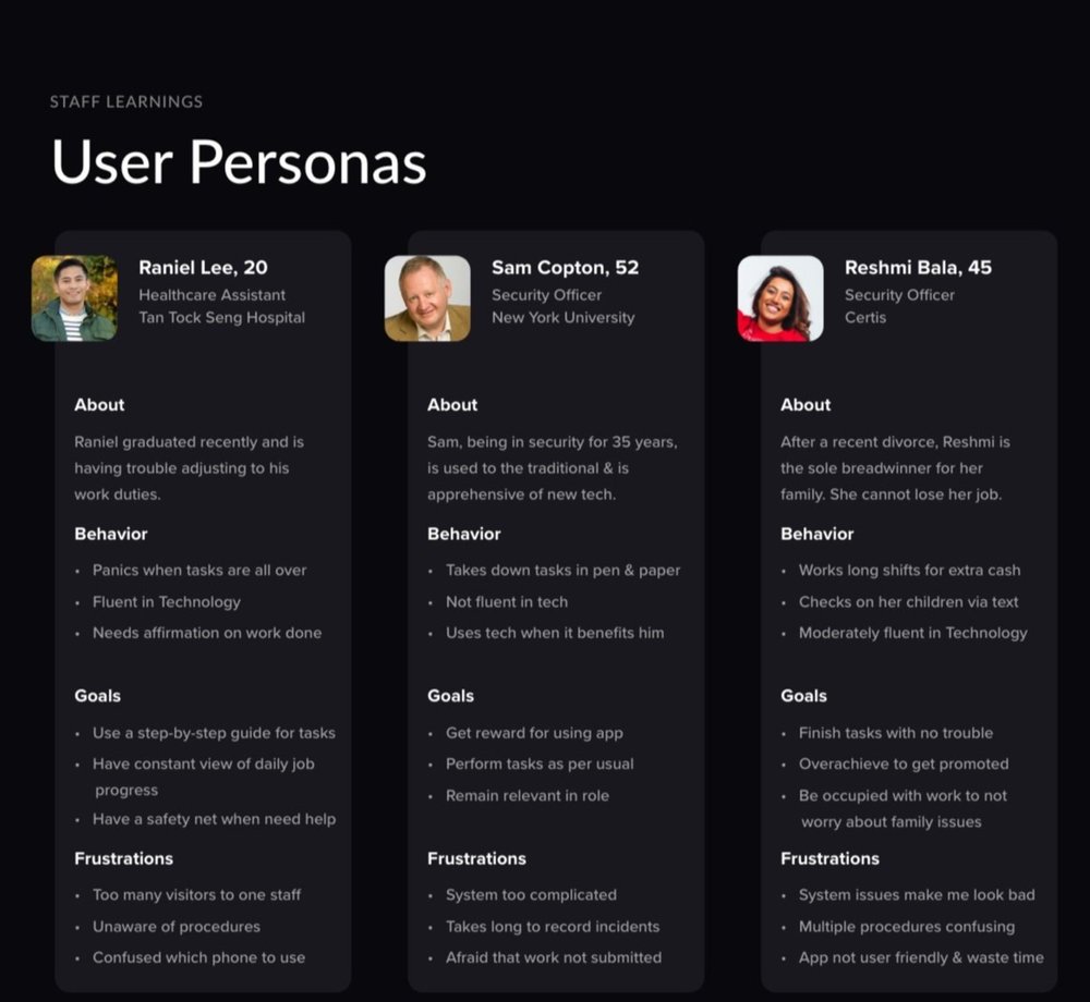 To ensure the product was inclusive for all, we conducted secondary research on pre-existing studies regarding the needs of the on-ground security staff, who were primarily aged 45 and above. Below are the findings we presented to the stakeholders, emphasizing the importance of democratizing the product to avoid exclusion.