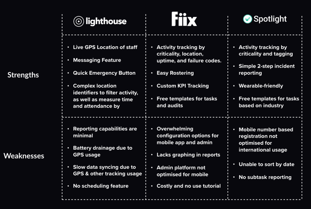 Incident management systems are not new, and we found notable overseas competitors providing the same functions as Certis, including real-time tracking of activity, events & incidents, a mobile app for staff, and an admin platform with reporting functions.