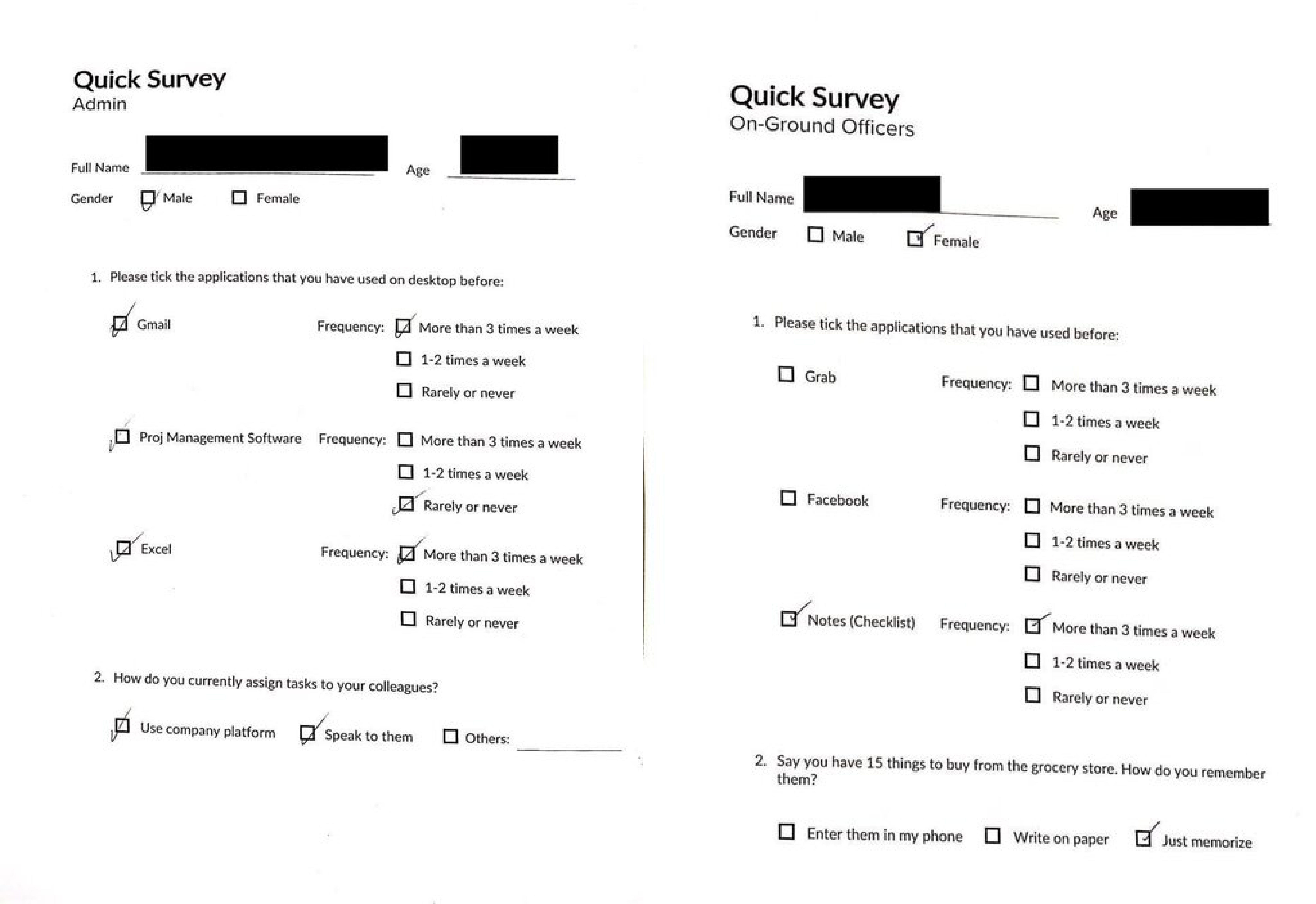 Survey chits to obtain quantitative data on tech familiarity, pain points and more.