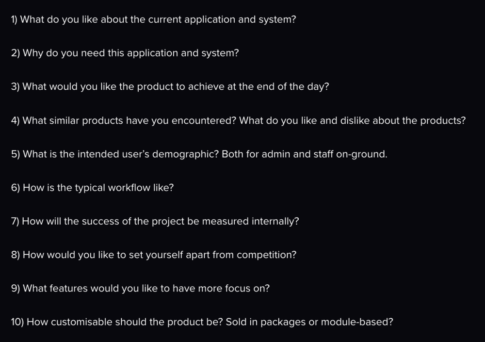 We began the redesign process by checking in with the client on their needs and thoughts on the current and future versions of their incident management system. We then interviewed the on-ground security staff and operator admin staff in two phases: a quantitative questionnaire followed by a qualitative interview. To encourage openness during the qualitative interviews, we made small talk to put the users at ease and encourage them to share more information